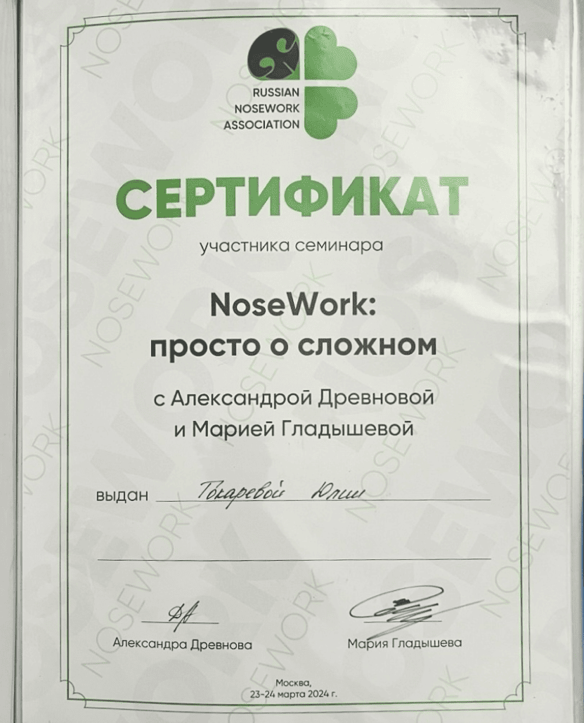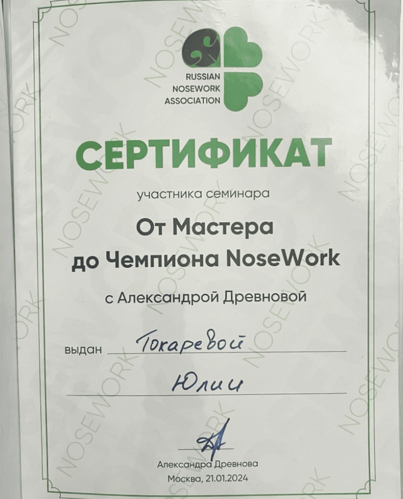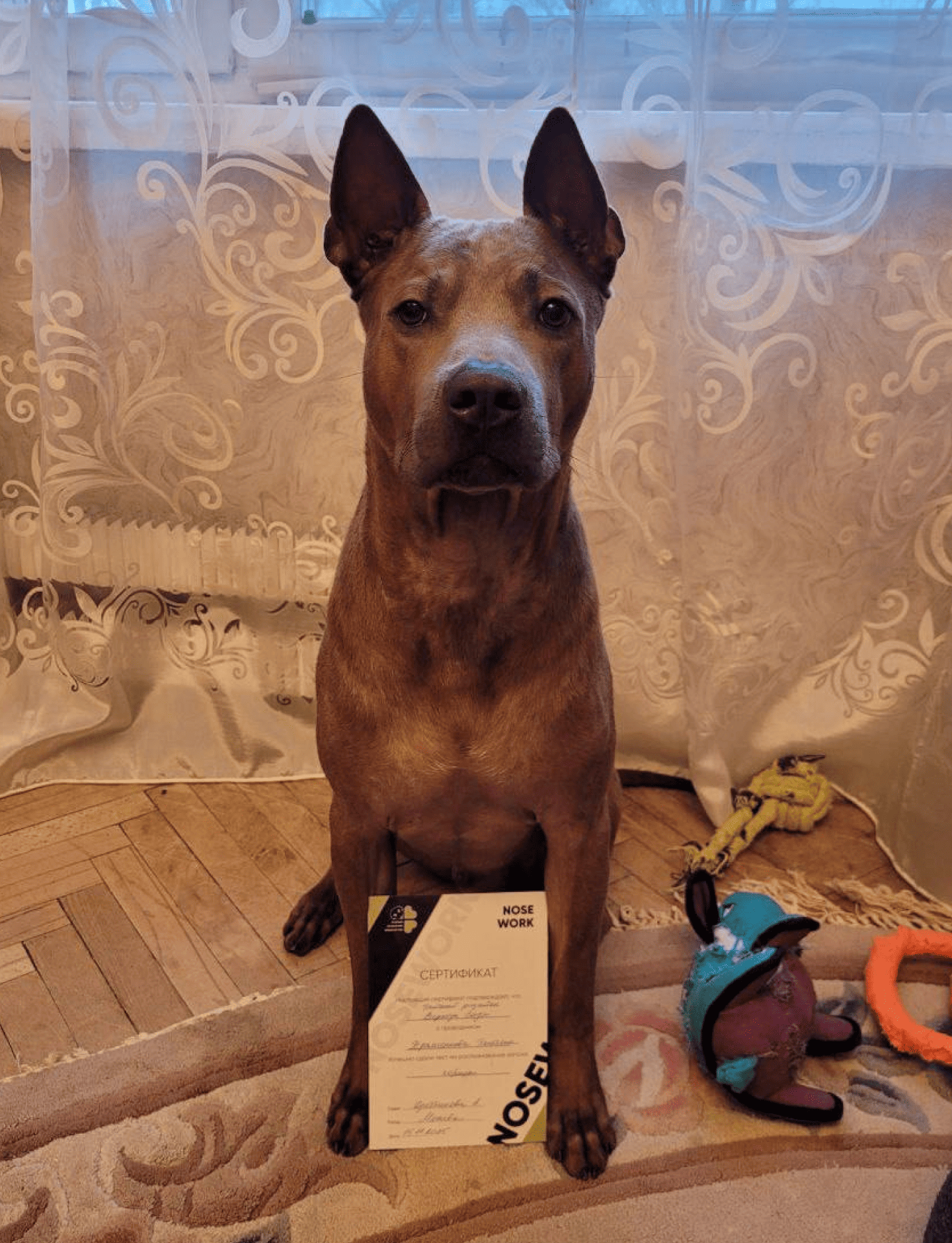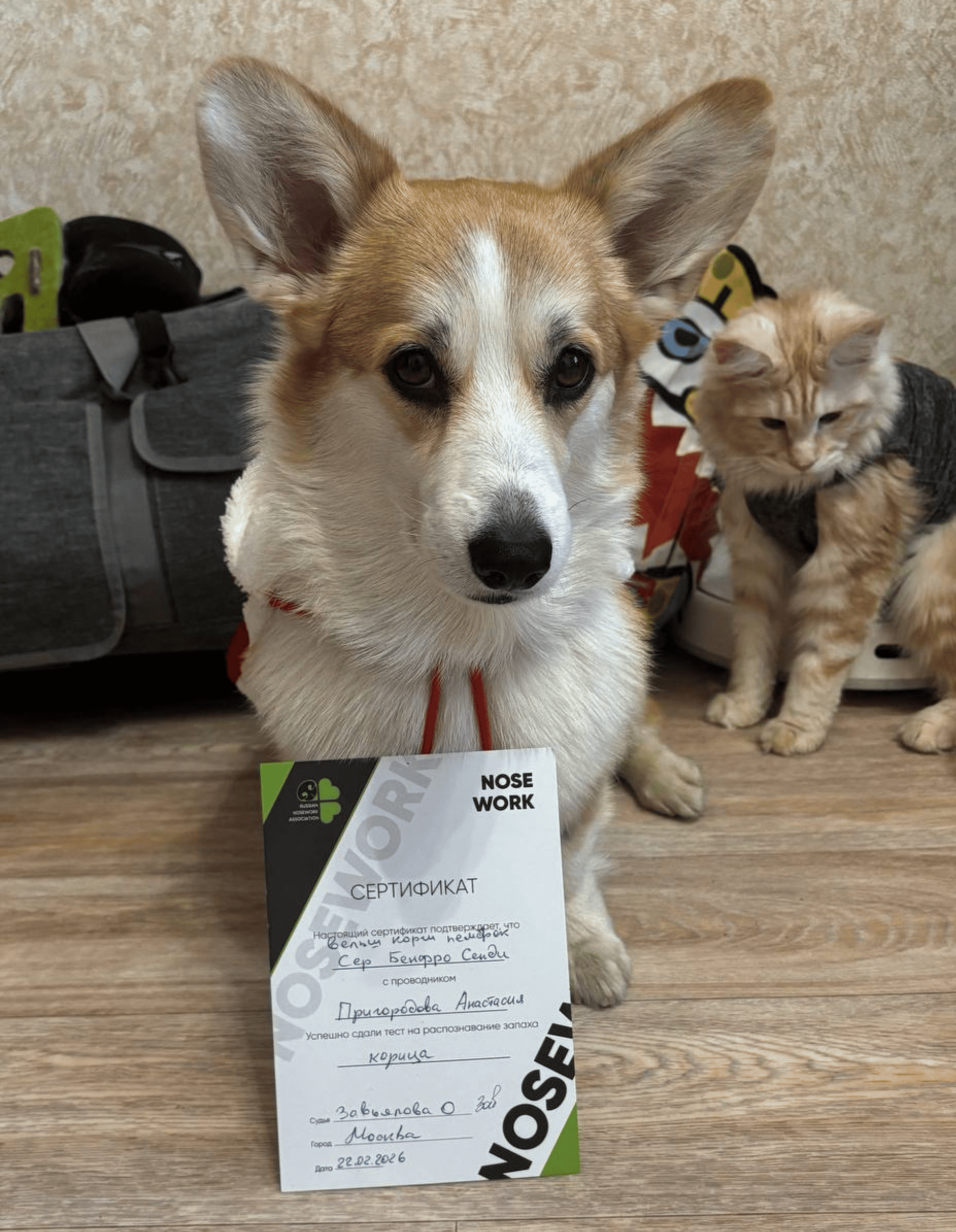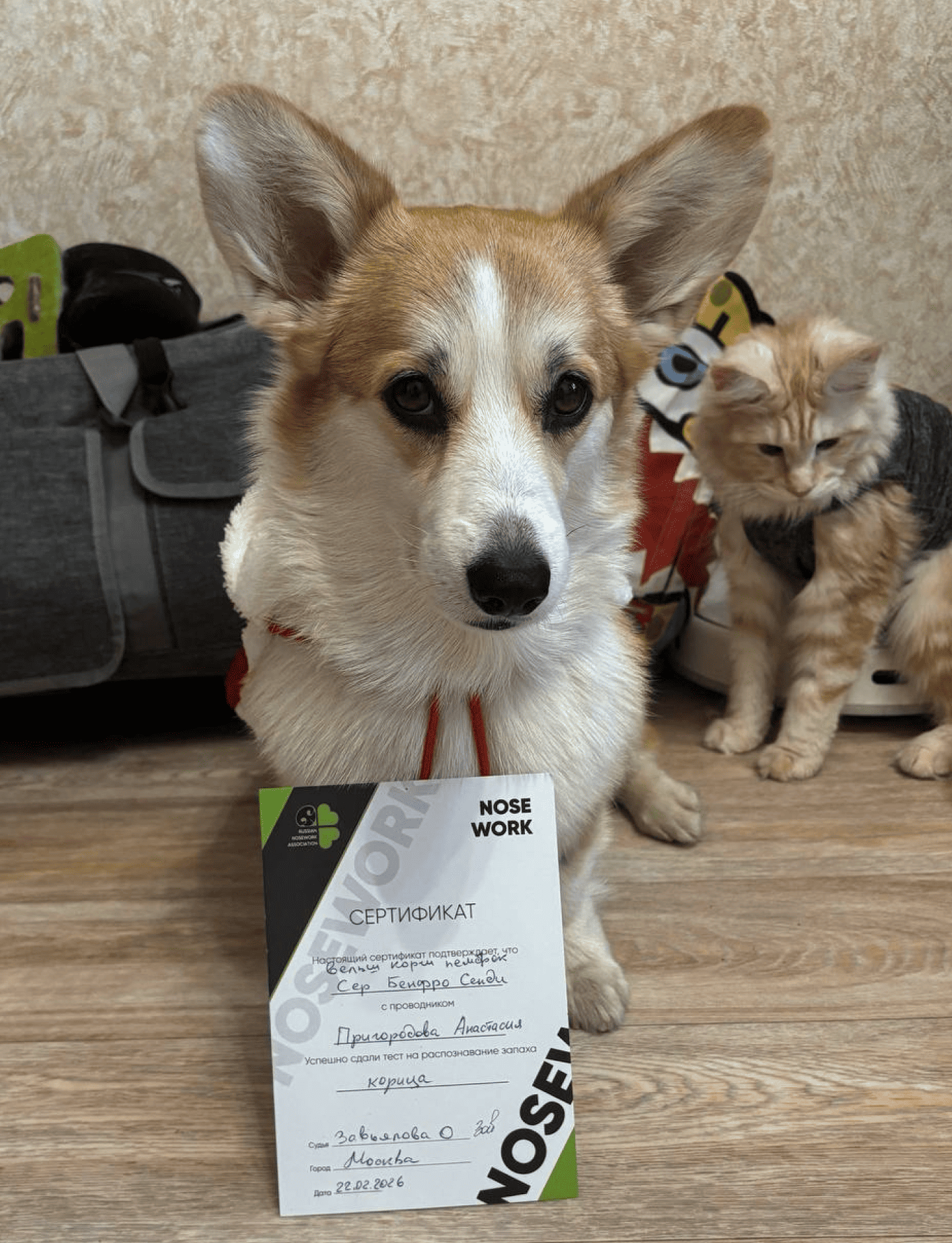 Можно заниматься онлайн прямо дома — нашу программу по ноузворку одновременно осваивают собачки из Москвы, Санкт-Петербурга, Самары и других городов. Упражнения построены так, чтобы можно было изучить базу и подготовиться к тестированию.